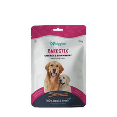 Barkstix Chicken and Strawberry dog treats are healthy and tasty treats made with fresh whole chicken and duck. Made with real ingredients like strawberry, fresh chicken liver and prebiotic chicory root extract, these treats are highly palatable and full of goodness. Use these vet approved treats as a reward for training or as a light snack between meals. They are made with real & fresh ingredients & have no added preservatives. Most importantly, they're vet approved.