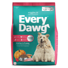 Wiggles EveryDawg™ Dry Food for Mother & Starter Pup for pregnant and lactating mothers and pups (3-12 weeks) is an energy dense meal that meets the nutritional needs of a lactating mother and her puppies. It is a complete and balanced meal rich with high quality protein, fresh vegetables and fruits and rice as core ingredients. It is fortified with superfoods like Red Raspberry leaves and Milk Thistle, which helps to increase milk production in mother dogs and Colostrum for immune response. This dry food helps mothers recover while also ensuring the healthy development of newborn puppies. Most importantly, it's vet approved.