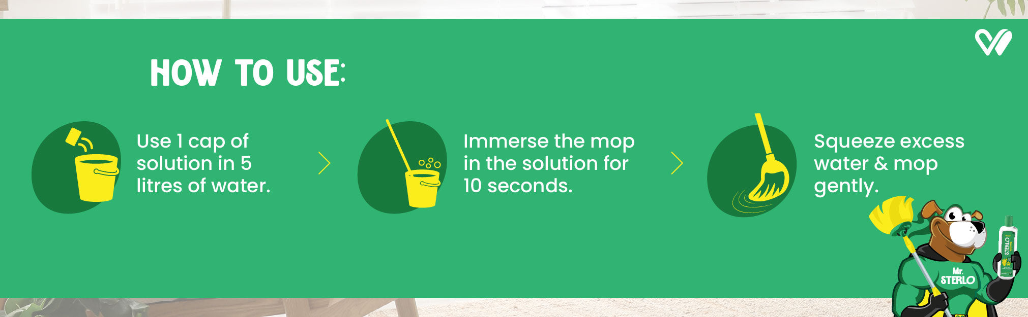 How to use: Use 15 ml solution (one cap full) in half a bucket of water (5litres)