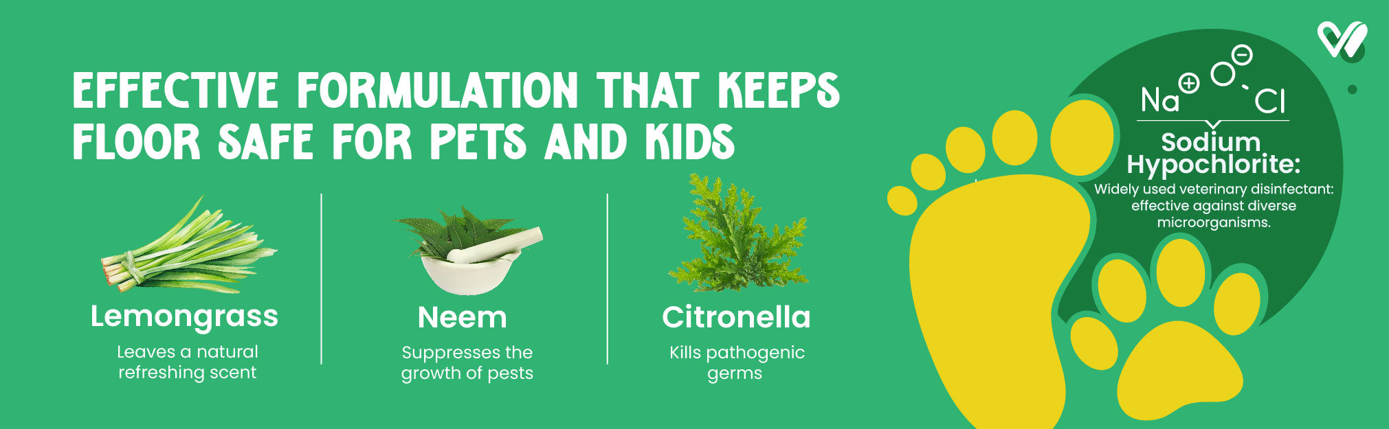 Neem, Citronella, Lemongrass, Tulsi, Sodium Hypochlorite, Chamomile, Chlorhexidine